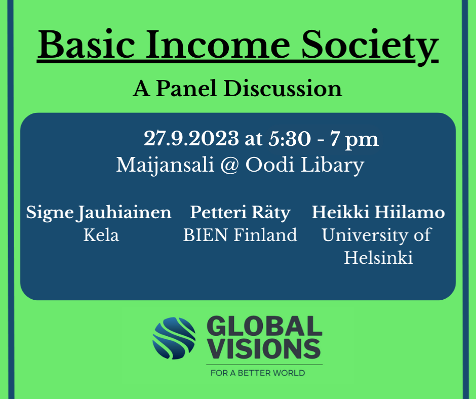 Global Visions will organise a panel discussion on 27th of September at 5:30 pm to discuss what a basic income society would be like in practice and theory. The discussion will cover a wide range of social perspectives on the topic. The implementation of a basic income requires first and foremost economic reforms and its financing will be the first practical issue to be addressed in the discussion. Next, there will be an examination of existing and conceivable positive social impacts that a social security reform such as the basic income could have. Finally, the panel will pursue above all to envision a future society in which basic income is implemented as a permanent pillar of social security. After the formal discussion, the panel will take questions from the audience, which can also be sent in advance to max.tallberg@globalvisions.fi